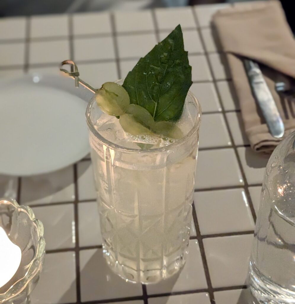 Fleur de lune 15$: This is an elevated Gin and Tonic. It has strong notes of basil and bitterness from the quinine (tonic). The libation is beautifully presented in a heavy highball glass and garnished with 3 sliced green grapes.